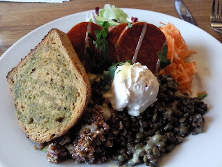 En i sällskapet är i varje fall vegetarian, så förslaget var att äta på Rost – en liten lunchrestaurang i centrum som har vegetarisk kost som tema. Man ska vara öppen för nya idéer och i varje fall prova på saker en gång. Tycker inte om nej-sägare… Enda maten som jag kände skulle fungera hyfsat i varje fall, var deras färskostsallad med det extra tillbehöret ”Spansk korv”. Beställde också en glutenfri variant.